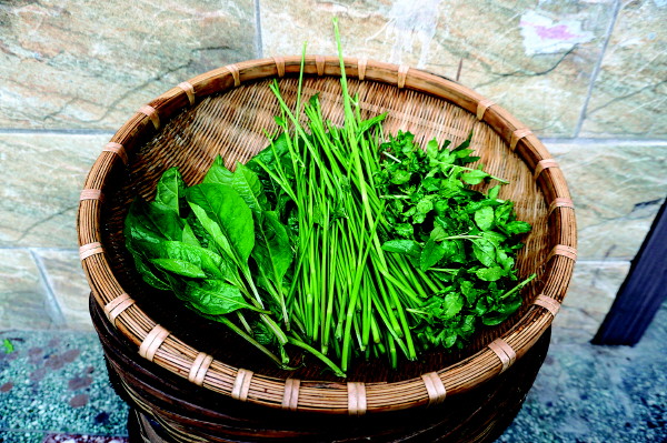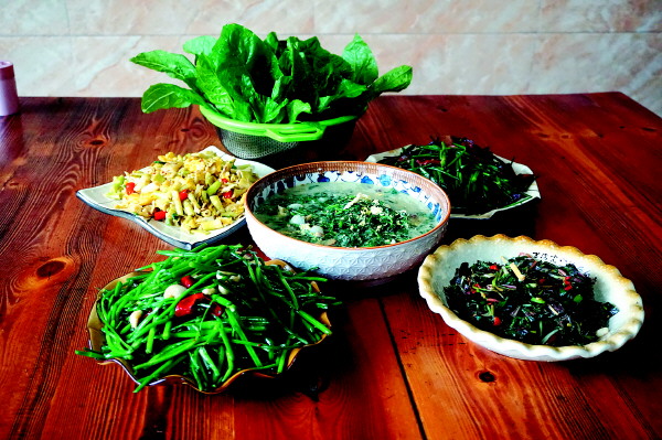 篮子再次被各色的野菜装满,姑侄俩满载而归。就着清清山泉水,她们把野菜洗净,引得路过的乡亲一阵羡慕。两大篮子青翠的野菜摆上灶台,为灶火上悬挂的腊肉填补了春的清新之气,更激发了全家人烹制野菜宴的热情。范玉成剥小春笋的工夫,丈夫已在厨房的烟火中炒野芹菜;老父亲在为凉拌鱼腥草配制着调料,姑姑已为枸杞蛋花汤找好了几个土鸡蛋……