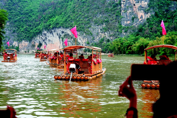 ▲4月20日,漓江风景名胜区首批30条纯电动力竹筏投入运营,为游客开启全新游览体验。 记者何平江 摄
