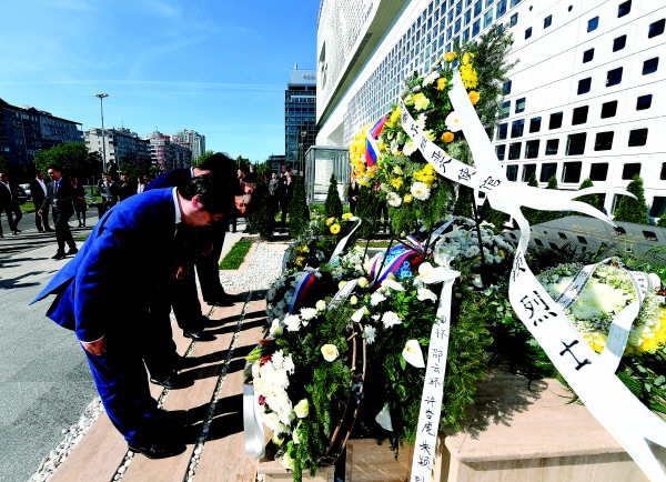 5月7日,在塞尔维亚贝尔格莱德,中资企业代表向中国驻南斯拉夫联盟大使馆旧址前的烈士纪念碑鞠躬。