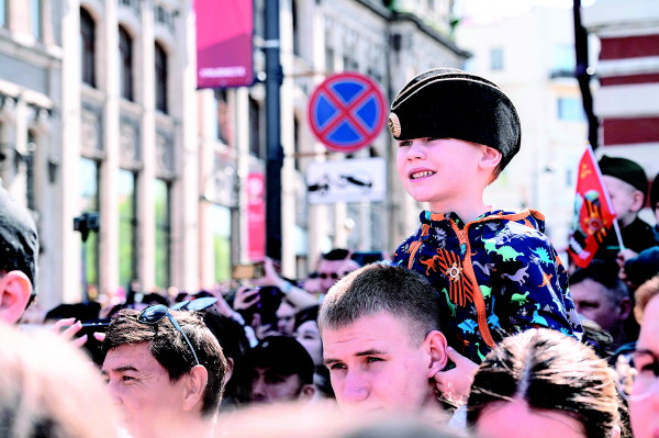 5月9日,人们在俄罗斯符拉迪沃斯托克市观看阅兵式。 新华社发(郭飞洲摄)