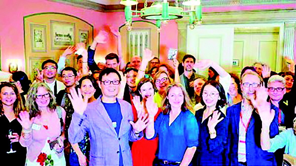 麦家(前排左三)在2018年法兰克福书展“麦家之夜”活动上。 (资料图片)