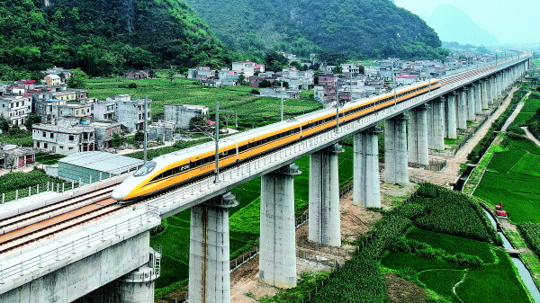 5月16日,高速综合检测列车行驶在贵南高铁上进行检测工作(无人机照片)。当日,CRH380AJ-0203高速综合检测列车对贵南高铁全线进行逐级提速试验,以时速180公里的速度级,对南宁东至荔波站区间高铁沿线的轨道、信号、通信、电务、综合接地等多个项目进行检测。列车因车身涂装成醒目的黄色,又被称为“黄医生”。 新华社发