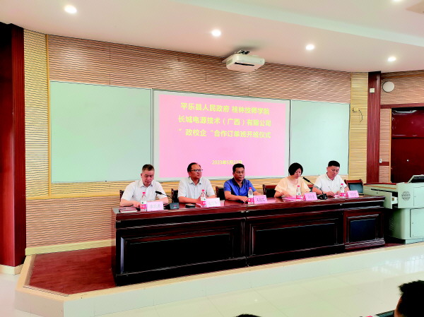 本报讯(通讯员金璐/文 徐雨成/摄)5月22日上午,平乐县人民政府、桂林技师学院、长城电源技术(广西)有限公司“政校企”合作订单班开班仪式在桂林技师学院录播室举行。学院党总支书记、院长王良优,副院长李绍勇,平乐县人力资源和社会保障局副局长廖素芳,长城电源技术(广西)有限公司综合管理部总监余加全,平乐县教育局基教股股长翟戊平,平乐县就业服务中心主任凌凤,平乐县各学校(合作订单班)领导及相关部门负责人参加开班仪式。开班仪式由技师学院副院长李绍勇主持。