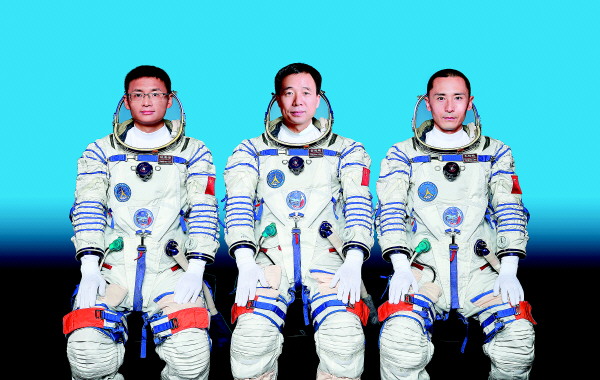 ▲这是神舟十六号航天员景海鹏(中)、朱杨柱(右)、桂海潮。 新华社发