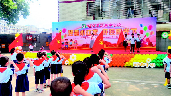 ▲5月31日,桂林市跃进中心校举行了以“我是小红花 开在阳光下”为主题的庆“六一”活动,组织开展了新队员入队仪式、文艺汇演、游园等活动,引领少先队员坚定理想信念,培育家国情怀,从小树立“强国复兴有我”的远大抱负,勇做担当民族复兴大任的时代新人。图为新少先队员在入队仪式上宣誓。龚文婷 摄