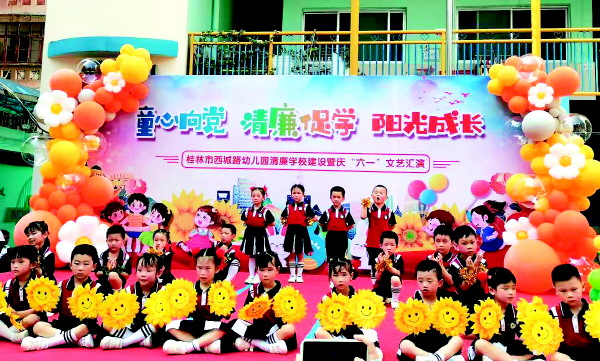 ▲5月30日上午,桂林市西城路幼儿园隆重举行“童心向党 清廉促学 阳光成长”清廉学校建设暨庆“六一”文艺汇演。孩子们在崇清敬廉、健康活泼的清廉校园文化氛围中迎接自己的节日。图为小朋友们正在参加演出。 陶莉娟 摄
