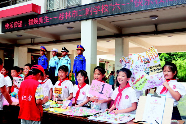▲“六一”来临之际,桂林市二附学校举办了“快乐传递,物焕新生”为主题的商品交易会,同一个节日不同的庆祝方式,“小学校,大社会”的活动既锻炼了孩子们的综合能力,又让孩子们在自己的节日里体验“做小老板”的乐趣。图为交易会活动现场。 张文娟 摄