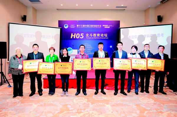 ▲第十三届中国卫星导航年会授牌仪式现场(左三为学校代表)。