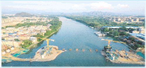 6月6日,净瓶山大桥重建项目现场,新净瓶山桥两组水中墩的墩柱已初见雏形。两组墩柱上塔吊正在作业,下方车辆忙碌着运送各种建材,工人们正在对桥梁紧张施工。项目去年1月5日开工,今年4月14日,整体工期的关键节点——水中两组主桥墩的浇筑工作顺利完成,目前重点在墩柱的上部结构、两岸的桩基和桥墩对称开展施工。
