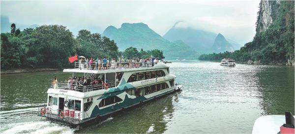 6月13日,满载游客的轮船航行在如画般的漓江烟雨中。据漓管委及桂林旅股相关负责人介绍,高考结束后漓江风景名胜区客流量明显增加,不少考生家庭组团前来游玩,给桂林旅游带来一波小高峰。记者何平江 摄