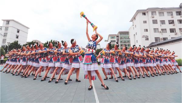6月13日,在恭城瑶族自治县民族职业教育中心,学生正在练习瑶族长鼓舞。