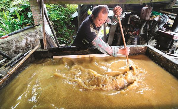 邓义珠说,造土纸是一件很费时费力的事情,工序繁杂耗时长,包括砍竹麻、破竹麻、泡竹麻、踩竹麻、舀纸、榨纸、起纸、晒纸等几十道工序。每道工序都需要尽心尽力,一个作坊要有两个人配合协作。村里一年有10个月的时间都有人在造纸。