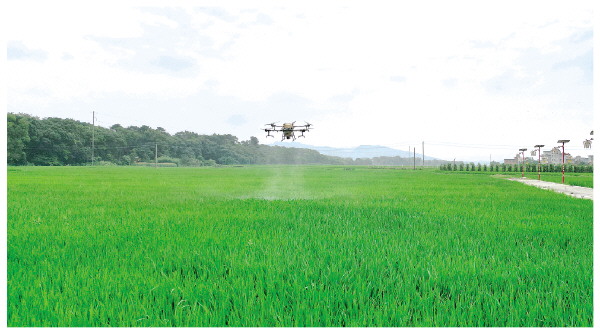 6月以来,早稻钻心虫、卷叶虫和稻飞虱等水稻病虫害都不同程度地发生。为做好水稻病虫害防控工作,连日来,全州县农业植保部门利用植保无人机进行统防统治工作。图为6月10日,植保无人机正在全州县龙水镇光田村稻田上空作业。 邓琳 摄