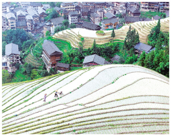进入6月份以来,龙胜各族自治县雨水充足,龙脊梯田景区内的层层梯田水满泥润,农户抢抓雨水时节,到田间犁田、除草、砍田基,处处呈现一派农忙景象,为今年的稻谷丰收和塑造秋黄梯田景观打下良好的基础。 吴生斌 摄