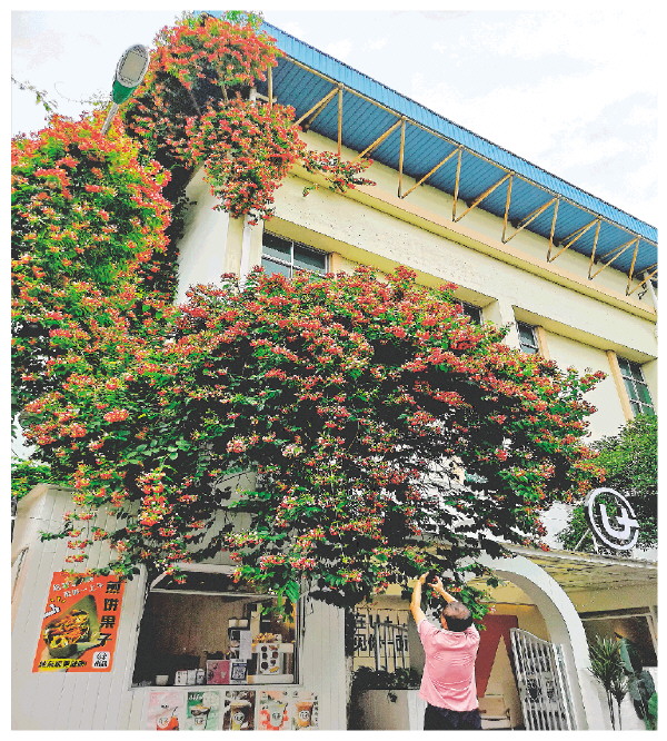 市体育中心一商家种植在二楼平台上的使君子长势非常好,正傍墙盛开。李腾钊 摄
