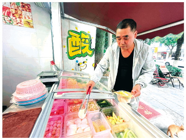 □本报记者蒋璇 文/摄 在桂林,无论是牙牙学语的孩子,还是热爱美食的老饕,都抵不住“酸”的诱惑。入夏后,七星区育才路上,一家名为“百味酸”的小店,生意很是火爆。只见进店客人络绎不绝,他们手拿套着塑料袋的小盆,各自在冰柜前挑选着酸品。萝卜酸、黄瓜酸、莴笋酸、刀豆酸、蒜头酸、马蹄酸、李子酸、桃子酸、香瓜酸、木瓜酸、芒果酸、菠萝酸,各类蔬菜酸和水果酸应有尽有。一旁的操作台前,一名皮肤黝黑的中年男子正熟练地帮客人把选好的酸品切成小块装进盒子,然后计算价格。他,就是店老板黄天桥。 “我们苦一点累一点没关系,孩子们过得好才是最重要的。”三年前,为了改善两个正在求学关键期的女儿的生活水平,当环卫工的黄天桥与退休赋闲在家的妻子经过筹划,决定利用空余时间做些小生意补贴家用。他们在向同乡好友学习了一段时间的腌酸手艺后,便张罗开起了酸店。小小的“酸”品,寄托着夫妻俩的小本创业梦,和他们对美好生活的追求。 黄天桥告诉记者,店内酸品更偏于南宁“酸嘢”的口味,属于桂南“酸嘢”系列,以生冷、新鲜、淡酸、甜中带辣为特点。目前,店里共有40多种酸品。 “大部分的蔬菜或新鲜水果都能够腌制成酸食,洗净后切成片状、块状,用米醋、白糖、凉开水等调配成的酸水来浸没腌制,一般腌制24个小时以上,不超过48小时就可以食用。”黄天桥说,腌酸要采用比较嫩、还未完全成熟的蔬菜或新鲜水果,这也是腌好酸的一个关键点。因为成熟或已经熟透的果品质地早已变松,腌出的酸不够脆爽,口感欠佳。 黄天桥说,不仅如此,酸的原料种类不相同,配方和腌制方式也略有差别。例如,腌制菠萝等自身呈酸性的原料一般不用食用醋,反而是用盐、老冰糖、甘草粉、辣椒面和五香粉等调味品腌制,这样做出来的酸很受当下年轻人的欢迎。 “做人不能好高骛远,创业更得脚踏实地。”黄天桥告诉记者,刚开酸店时,生意冷清,一天只能卖出几十块的东西,但夫妻俩并没有想过放弃,万事开头难,他一直坚信,只要将口味和品质掌握好,不怕生意不红火。 每次采买腌酸的原材料时,黄天桥都坚持选购同类产品中的优质品,在他看来,入口的东西口味固然重要,但食品安全一定是放在首位的。腌好的酸有保存期限,一般三至五天,遇上阴雨天等恶劣天气顾客不多时,滞销的酸品就会全部倒掉。“虽然看着很心痛,但做生意一定要讲良心,对顾客负责。” 正如他所想的那样,小店凭借着正宗酸爽的口味、实惠的价格和热情的待客之道,回头客越来越多。每天从上午11点到晚上10点,来来往往的食客见证着小店的兴旺,见证了夫妻俩的勤劳和付出。 “每斤酸的售价是15元,品种任选。最好的时候,一天能卖五六百块。”如今,黄天桥夫妇靠着卖酸,把一家人的日子越过越甜。两个女儿也都如愿考上了心仪的学校,带着父母教给她们的踏实和努力品格,追求着属于自己的美丽人生。