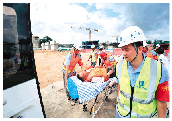 6月28日,净瓶山桥拆除重建工程项目现场举行了桥梁施工落水事故应急演练。本次演练由桂林市应急管理局、桂林市住建局、桂林市海事局主办,中国建筑第八工程局有限公司、中建八局第二建设有限公司承办。演练通过模拟施工人员不慎落水到被成功营救的全过程,检验了桥梁施工应急预案的可行性,以及救援各方的联动机制和实战能力。图为“落水人员”被救上岸后送上救护车由医务人员进行抢救诊治。 记者苏展 摄