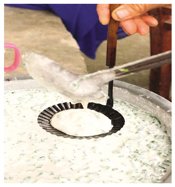 将加入葱花、食盐搅拌均匀的米浆舀入模具准备炸制香粑。