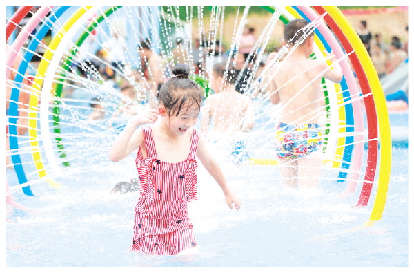 7月8日,小朋友在贵州省镇远县羊坪镇一家水上游乐园戏水游玩。炎炎夏日,人们戏水游玩,乐享清凉。新华社发唐鹏 摄