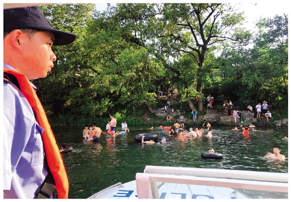 ▲7月23日,漓江斗鸡潭水域,“警察蓝”在烈日下守护着水域的安全。
