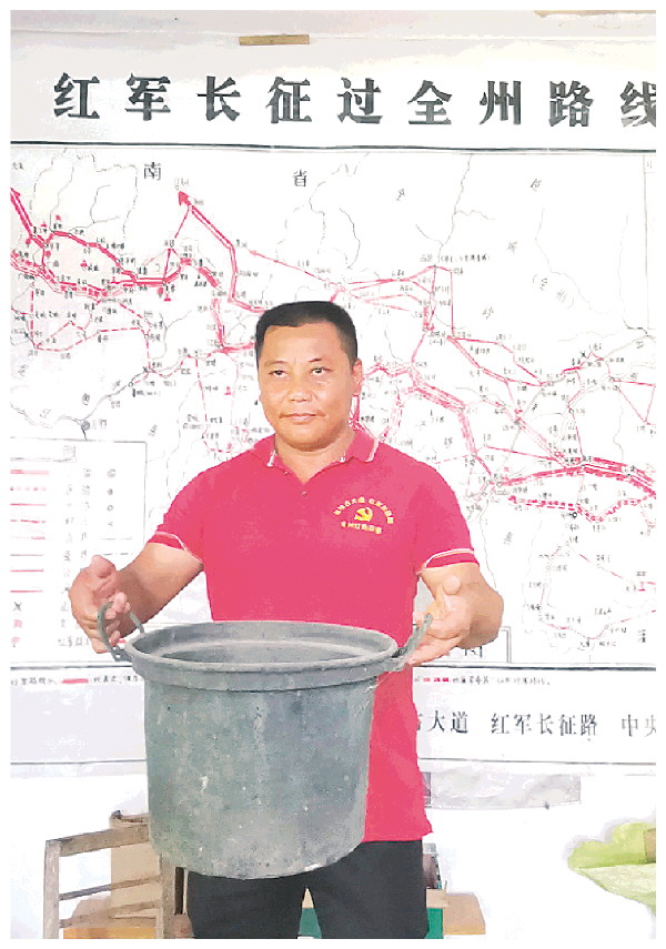 廖荣辉展示其收集到的红军当年用过的大锅。记者秦丽云 摄