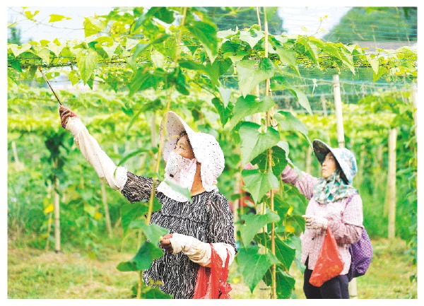 走进恭城瑶族自治县三江乡三联村罗汉果种植基地,一株株罗汉果藤蔓已攀爬上棚网并铺展开花,郁郁葱葱的枝叶上,金黄色的小花随风摆动。大家充当着辛勤的“蜜蜂”,穿梭在果花丛中,有条不紊地完成人工授粉,迎接又一个丰收年。“今年我们合作社流转土地400亩种植罗汉果,长势非常好,按照去年的收购价格,今年的收入预计在340万元左右。”合作社负责人黄春潮看着田里罗汉果的长势,脸上露出了喜悦的神情,他乐呵呵地告诉记者。