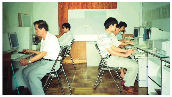 图②:1998年6月,水情工作人员在进行洪水预报作业。