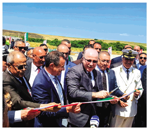 8月12日,在阿尔及利亚塔夫省,阿尔及利亚总理阿卜杜拉赫曼(前左三)出席阿尔及利亚东西高速公路东标段84公里项目通车仪式并剪彩。