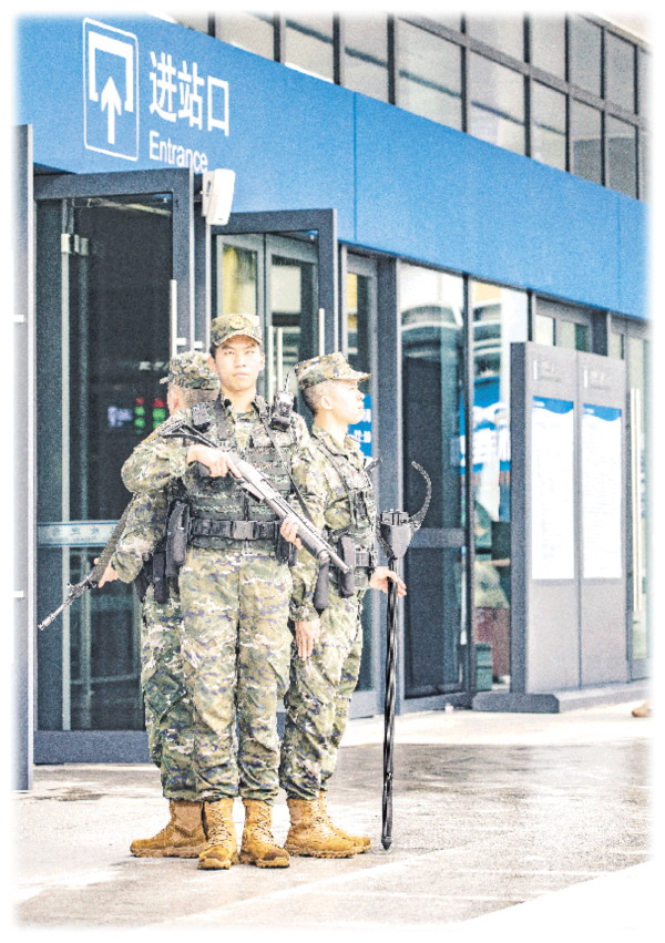 武警官兵在车站进行定点警戒。施晨洲 摄