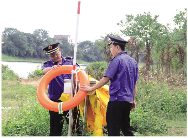 城管队员在漓江边检查应急救援物品是否齐备完好。