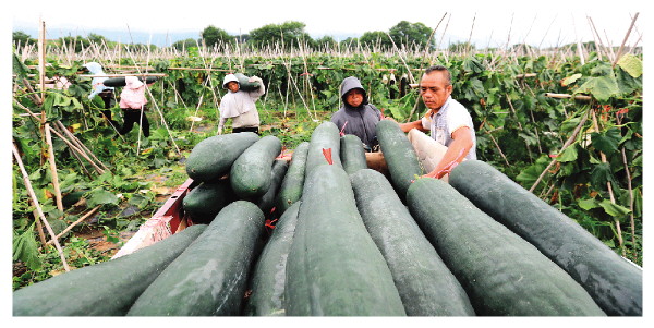8月23日,在恭城瑶族自治县栗木镇上灌村冬瓜种植基地,当地农户正将刚采摘的冬瓜装车,准备外运销售。
