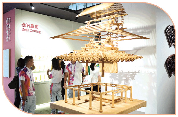 9月12日,媒体记者参观亚运村内展示的金石篆刻和榫卯结构展品。新华社记者翁忻旸 摄