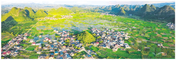 秋雨过后,临桂会仙玻璃田格外亮丽。在群山环绕中,村庄里房屋错落有致,阡陌交通,青山与云海、水与天交相辉映,一派“采菊东篱下,悠然见南山”的意境。