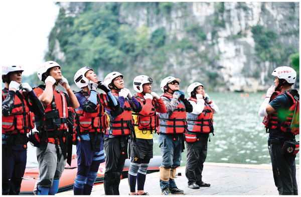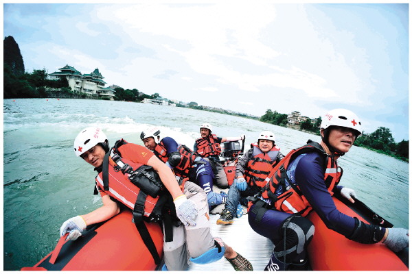 近日,记者来到漓江斗鸡山水域,十余名来自桂林市红十字会搜救救援队的队员正在进行救援演练。桂林市红十字会赈济救护部部长陈新玉向记者介绍,这是一支全新的搜救救援队,刚刚成立两个多月,队员都是来自各行各业的志愿者,平时都有自己的本职工作,为了尽快提升这支队伍的救援能力和水平,队员们每周都利用周末休息时间,聚在一起进行常态化训练和演练。
