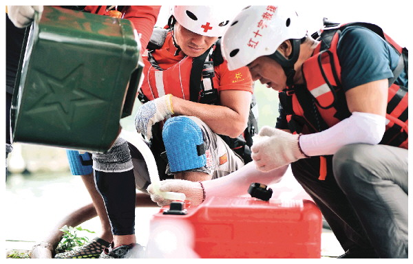 指导周华英操作救生艇的是队长廖立家。他是龙胜二龙水电站的一名管理人员,本身喜欢户外项目,在加入红十字会之前,他已经考取了攀岩指导员证、激流救援证、绳索救援证等相关证书。2016年,在朋友的推介下,廖立家加入了红十字会,积极服务各类公益培训活动。