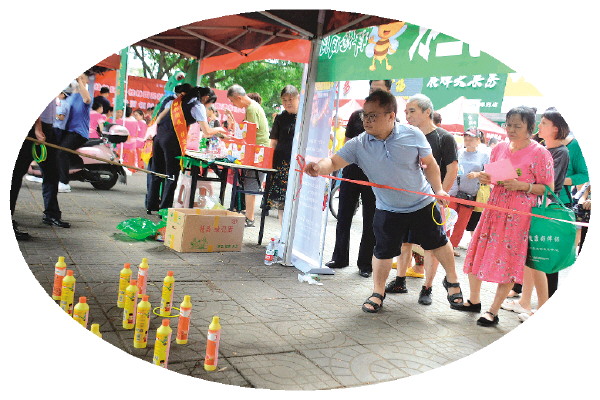 台下和台上一样精彩:呆萌的眼睛、翠绿的身姿……桂林国民村镇银行把网络上爆红的“网红青蛙”带到了现场,引得小朋友们争先恐后与其互动。居民除了能和“网红青蛙”拍照打卡外,还能参与到比赛猜拳和套圈圈的游戏中,获得大米、抽纸、洗洁精等丰富奖品。桂林国民村镇银行还为大家准备了冰凉可口的凉粉,来到摊位即可免费品尝。