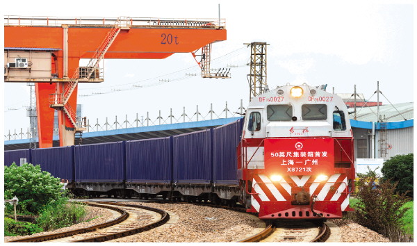 9月20日,上海发往广州的载有40个50英尺集装箱的X8721次多联快车从铁路上海货运中心闵行站出发,驶往广东东莞。