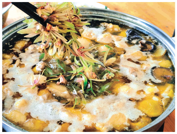 □本报记者刘菁 通讯员黄昌电 谢淑敏/文 记者刘菁/摄 兰花素有“花中君子”之称,因其花、叶形状之美,许多人都会买回家种植、观赏。但鲜少有人知道,部分兰花是可食用的,也是一味中草药,例如建兰就有养阴润肺、利水渗湿、清热解毒等功效,具有一定的药用价值。 家住荔浦市双江镇官相村的韦从刚就种植了许多兰花,用他自己的话说,他是地里摸爬出来的“土专家”。他用兰花和农村特有的母鸡做出了一道特色的菜肴——兰花鸡,这道菜不仅在村里闻名,也有不少食客在花开季慕名而来,不仅为了购买美丽的兰花作为观赏,更重要的就是为了吃上一口在这里才能吃到的兰花鸡。 这兰花鸡果真这么受欢迎?期待已久,9月19日一大早,记者驱车来到了韦从刚的兰花种植基地。抬眼望去,绿油油的种植基地里,一个身着白色上衣的人正在忙碌着。此时的韦从刚,恰好结束了最后一批兰花交易,见到记者来,他就迫不及待地带着记者去看将要拿来做菜的兰花——四季兰。 如果不是韦从刚介绍,在这遍地是兰花的种植基地里,真是辨别不出有哪些品种。记者走近一看,四季兰的叶片细长,除了绿色之外并无杂色,几朵小花开在绿叶中间,花朵底部为绿色,花瓣尖呈现出微微的粉紫色。风一吹,花朵、叶子随风摇曳,送来阵阵清香。“平时我们养护的其他兰花,一般一年只开一次花。但是四季兰,一年可以开两次,甚至有时候开三次花。花期可以跨越四季,所以叫四季兰。”韦从刚说起兰花便滔滔不绝。随后,他将兰花摘下后带回,再把花一朵一朵摘下,过水冲洗一遍,就可以拿来备用了。 制作兰花鸡,当然少不了鸡。“最好是用刚下完鸡蛋的母鸡,营养和口感比较好。如果家里没有的话,土鸡也是可以的。”韦从刚一边介绍,一边将鸡打理干净。随后他来到厨房,拿出葱花洗净,把姜切片,泡发干香菇,就可以煲鸡汤了。 “做这个菜其实并不复杂,就是按照平时做鸡汤的办法,先把鸡炖好,最后放入兰花就可以了。”韦从刚一边介绍,手里仍继续忙碌着,斩鸡、切葱样样不落。记者看着韦从刚熟练的刀工,发现韦从刚应该是经常下厨的人。“我女儿特别爱吃我做的菜,尤其是兰花鸡。她每次想吃,我就立马做给她吃。”提起女儿,韦从刚的语气满是宠爱。 接着,韦从刚取来一口锅,用姜片打底,放入鸡块和香菇,再加入乡村特有的甘甜的山泉水。将鸡肉炖煮15分钟后,即可倒出、换锅,再撒上葱花。用电磁炉再次加热后,拿一个小碗将鸡油撇出少许备用。“因为兰花吸油,要一边吃,一边加点油才香。”韦从刚解释道,接下来就可迎接“主角”登场。在鸡汤再次沸腾后,兰花在餐桌上“盛开”,煮至花朵微微透明即可食用。记者感受着阵阵蒸汽,花香瞬间溢满整个屋子。 鸡汤的香气夹杂着兰花的花香,让记者迫不及待地想尝上一口。韦从刚却说:“你先喝口汤,再尝一下兰花,最后再吃肉。”于是记者按照建议,一步步体验兰花鸡。鸡汤微黄,兰花泡在汤里,看起来十分雅致。喝一口鸡汤,味道十分清甜,与普通鸡汤不同的是,有着很浓的兰花香。接着夹起几朵兰花,嚼在嘴里花香四溢,花朵中间口感微脆,花瓣吃起来却是绵绵的。令记者感到震惊的是,兰花吃起来却没有想象中的甜味,取而代之的是苦味。一时间,味蕾受到刺激,再喝一口汤后,苦味便烟消云散,只剩鸡汤和花香的回甘。鸡肉就更妙了,也许是所用鸡肉本身的特质,再加上用山泉水炖煮出来,肉质不柴,依旧保持着紧致,虽然只加入兰花煮几分钟,鸡的皮和肉都渗透着兰花的香气。记者瞬间就明白了,原来这就是兰花鸡远近闻名的原因。 鲜花入食在我国是由来已久。在桂林的乡村里,像兰花与鸡的别样结合,给舌尖带来了新奇的体验。这是融入了乡村农人的智慧,用随手可得之物,将生活过成了一门艺术,把做美食当作一种乐趣。