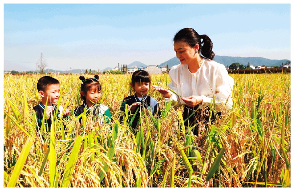 10月16日,江西省新余市渝水区下村镇中心幼儿园的教师带领孩子走进稻田,了解水稻知识。当日是世界粮食日,各地幼儿园、小学、中学等开展丰富多彩的活动,让少年儿童认识粮食、体验秋收,培养孩子们爱惜和节约粮食的意识。新华社发(廖海金 摄)
