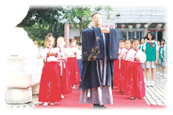 张鹏程带着学生排演《卓然礼学堂》。 记者陈静 摄