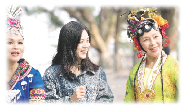 2022桂林艺术节期间,陈梓(中)参加艺术节活动与戏曲演员们互动。 (受访者供图)
