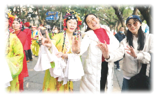 在滨江路的地方曲艺展示中,黄海姑跟着戏曲演员一招一式学习了戏曲中“开门”的动作,这样的体验让她很开心,也很惊讶:“想不到戏曲中光是‘开门’就有这么多的环节,这么多的讲究。”黄海姑说,传统戏曲无论是从服装、头面,还是扮相、身段以及唱腔等都非常美,非常值得欣赏。
