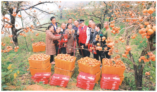 近期,桂林各地乡村的柿子都进入了成熟收获期。11月11日,平乐县公安局驻长滩村第一书记韦小勇带着网络直播设备,来到平乐镇长滩村脱贫农户的柿子园,帮正在采摘柿子的农户开展果园直播带货,对脱贫农户进行现场直播培训,促进农户增收,助推强村富民。 陈国海 摄