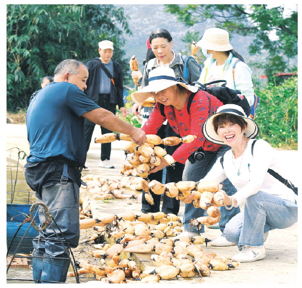 人们在荷塘边抢购刚采收的新鲜莲藕。
