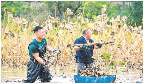 当天上午9点多,在琴潭岩村荷塘基地连片的藕田里,藕农们身着防水衣,俯身在水田里仔细摸索,不时将一根根新鲜的莲藕“揪”出“泥潭”,然后挑运、清洗、装车,荷塘基地内一片繁忙的景象。