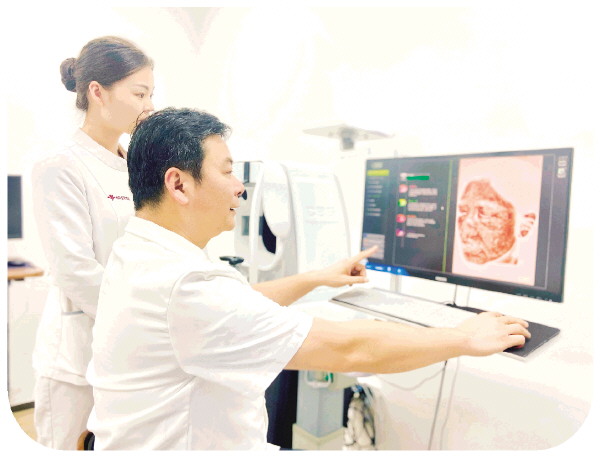 黄熙主任正在分析患者面部皮肤状态,确定个体化治疗方案。