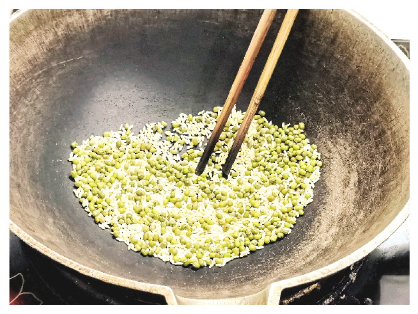 用小火将大米和绿豆炒熟。