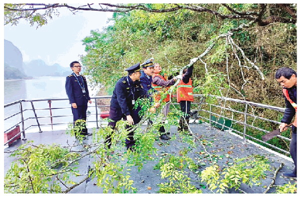 11月15日,桂林漓江海事处、桂林漓江风景名胜区综合执法支队、自治区交通运输综合行政执法局第四支队、雁山区漓管办等多部门联手,出动30余名执法人员和3艘执法船艇现场勘查。在现场,执法人员发现左岸一大片树枝和20余根零散的凤尾竹生长茂盛,垂下的枝条向航道处“扩张”了将近4米,社公滩水域水流湍急,且枝条正好处于航道转弯处,驾驶员经过此处时存在视觉盲区,影响航行安全。为了及时消除安全隐患,执法人员在容发保洁公司的配合下,修剪并清理了遮挡视线的树枝和凤尾竹,恢复了漓江社公滩水域的良好通航环境,保障了游船航行安全。