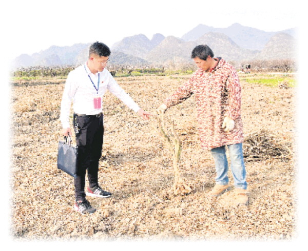 平乐县二塘镇大力实施退果还粮工作,积极引导农户将低效低产果园退出,种植水稻。 图为二塘镇纪检监察干部紧盯马家村“退果还粮”示范基地建设开展全过程监督,保障粮食增产、农民增收。陶伟权 摄
