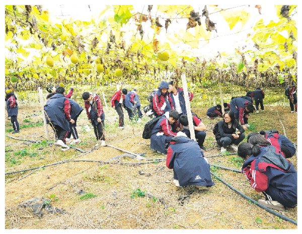 学生在研学基地内了解罗汉果滴灌种植技术。